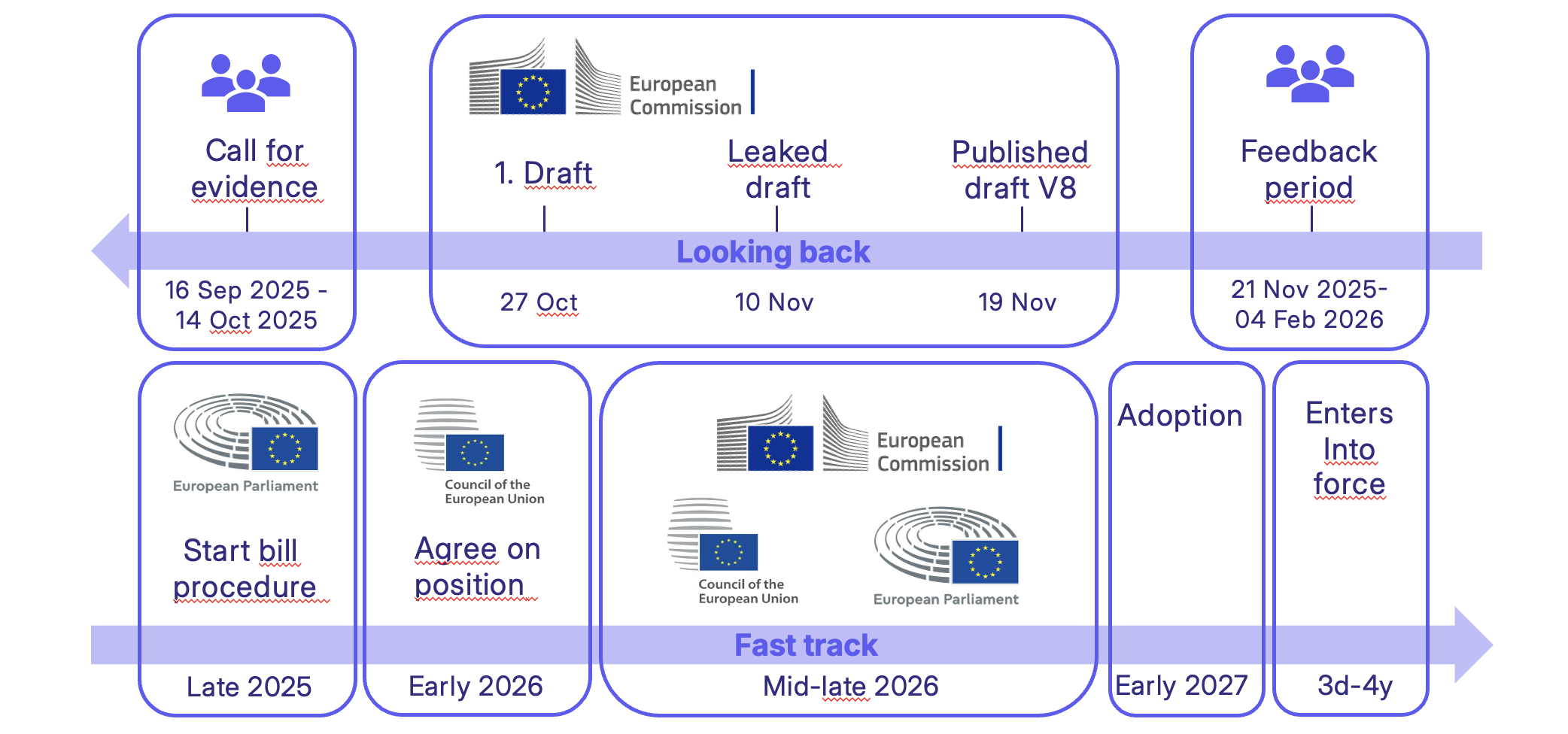 Looking back, the process began with a call for evidence from 16 September to 14 October 2025, followed by a Commission draft on 27 October 2025, a leaked draft on 10 November 2025, and a published draft V8 on 19 November 2025. The feedback period runs from 21 November 2025 to 4 February 2026. Looking ahead, the Parliamentary procedure is expected to begin in late 2025, the Council position in early 2026, and the main interinstitutional negotiation phase in mid- to late 2026.