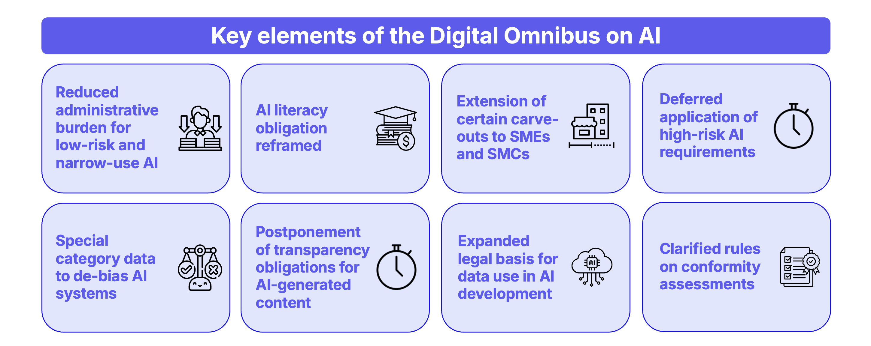 Alongside the main Omnibus, the package includes a separate AI Omnibus proposal. Its direction is to reduce administrative burden for low-risk and narrow-use AI, reframe the AI literacy obligation, extend certain carve-outs to SMEs and small mid-caps, defer the application of high-risk AI requirements, postpone some transparency obligations for AI-generated content, expand the legal basis for data use in AI development, and clarify conformity assessment rules.